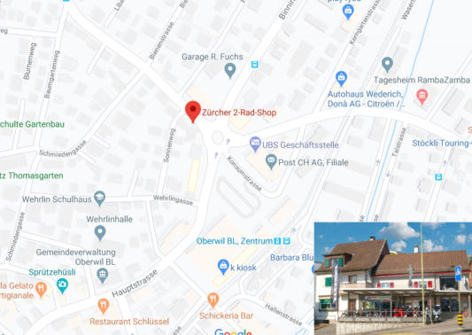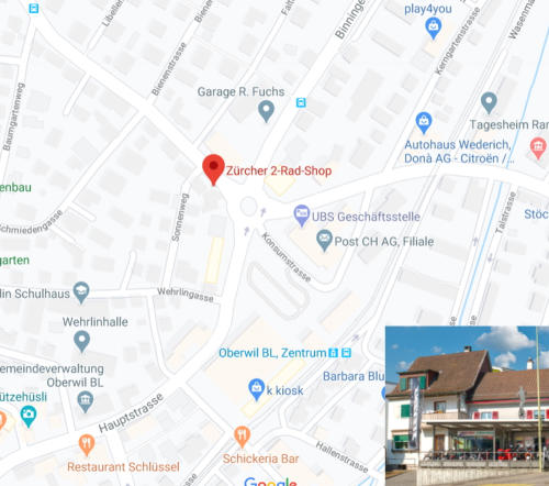 Zürcher 2-Rad-ShopAllschwilerstrasse 3CH- 4104 Oberwil BL+41 61 401 16 70zuerchervelo@bluewin.chÖffnungszeiten:Di + Mi 8.00-12.00 14.30-18.00 UhrDo 8.00-12.00 Uhr ----------Do Nachmittag bis Montag geschlossenReparatur nach Voranmeldung !